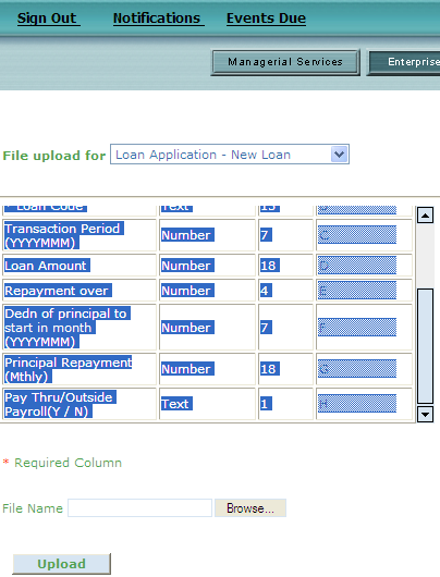 Employee Number | * Loan Code | Transaction Period (YYYYMMM) | Loan Amount | Repayment over | Dedn of principal to start in month (YYYYMMM) | Principal Repayment(Mthly) | Pay Thru/Outside Payroll(Y / N) |