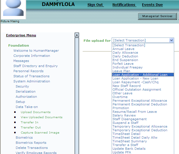 Ü Click on Foundation Modules/System administration/ Data take on/ transfer in/Select Loan Application- New Loan/ Click on the browse button/browse to the location where you saved the layout as indicated above e.g. desktop/Select the file/ Click on the Upload button.